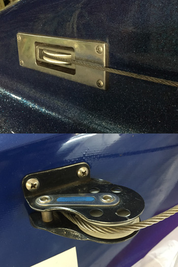 Boat pulley steering system. The white plastic pulley has a 360 Degrees rotation. This pulley also feeds line into anchor control system to avoid uneven line buildup. F13 13 Steering Wheel stainless spokes 7995.